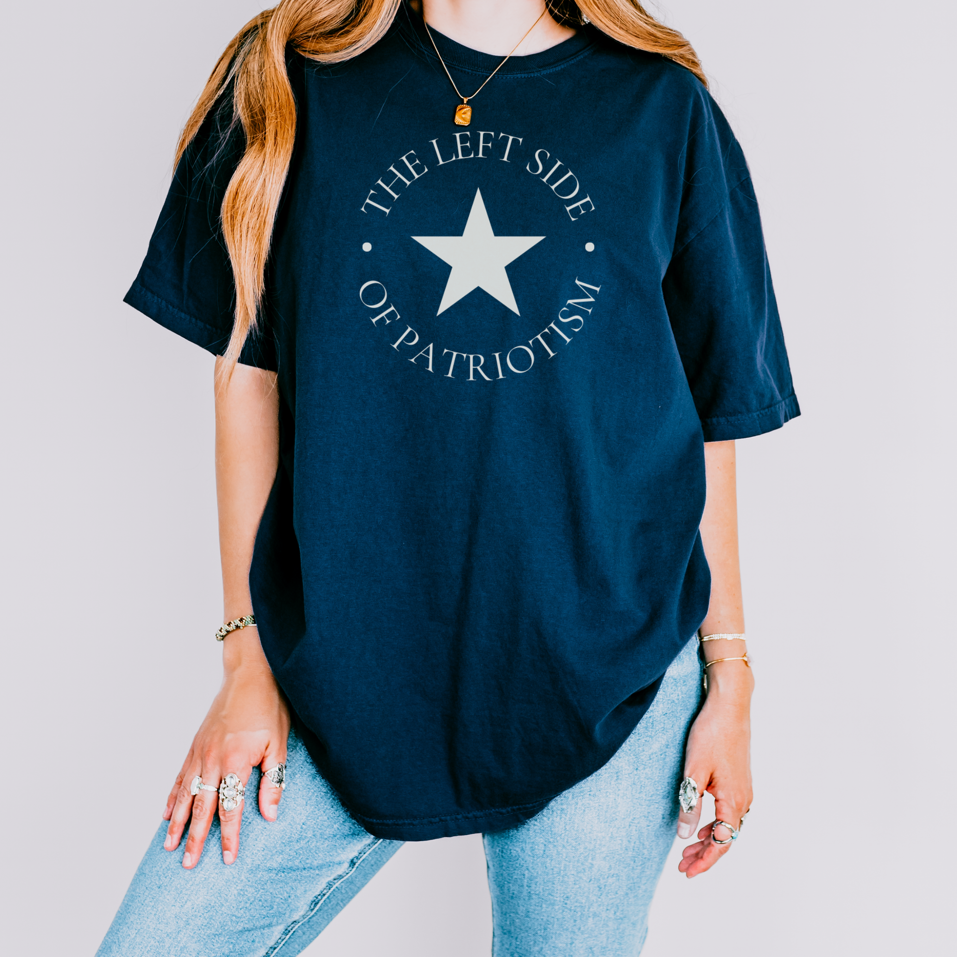 The left side of patriotism is rooted in democracy, equality, and belonging. This shirt represents a love of country that embraces progress and includes everyone in the promise of America.